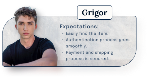 Using a customer journey map helped me better understand the user's thoughts and emotions throughout the process of using a similar app. Here we have Grigor, a freshman in college and who just landed his first job. He’s also a shoe and streetwear collector. Grigor’s excited to buy a pair of shoes he's long been waiting for, especially after seeing that it’s finally available in his size.